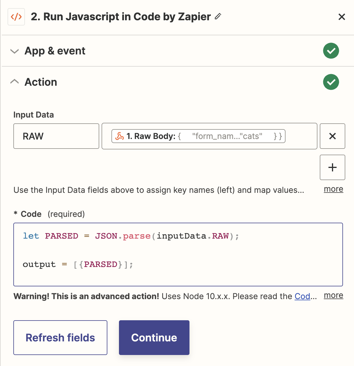 You will have to set the `Input Data` to `RAW` and the Text will be the returned `raw_body` result from the webhook catch. For the code, we are adding a step manually for Zapier to parse the code.